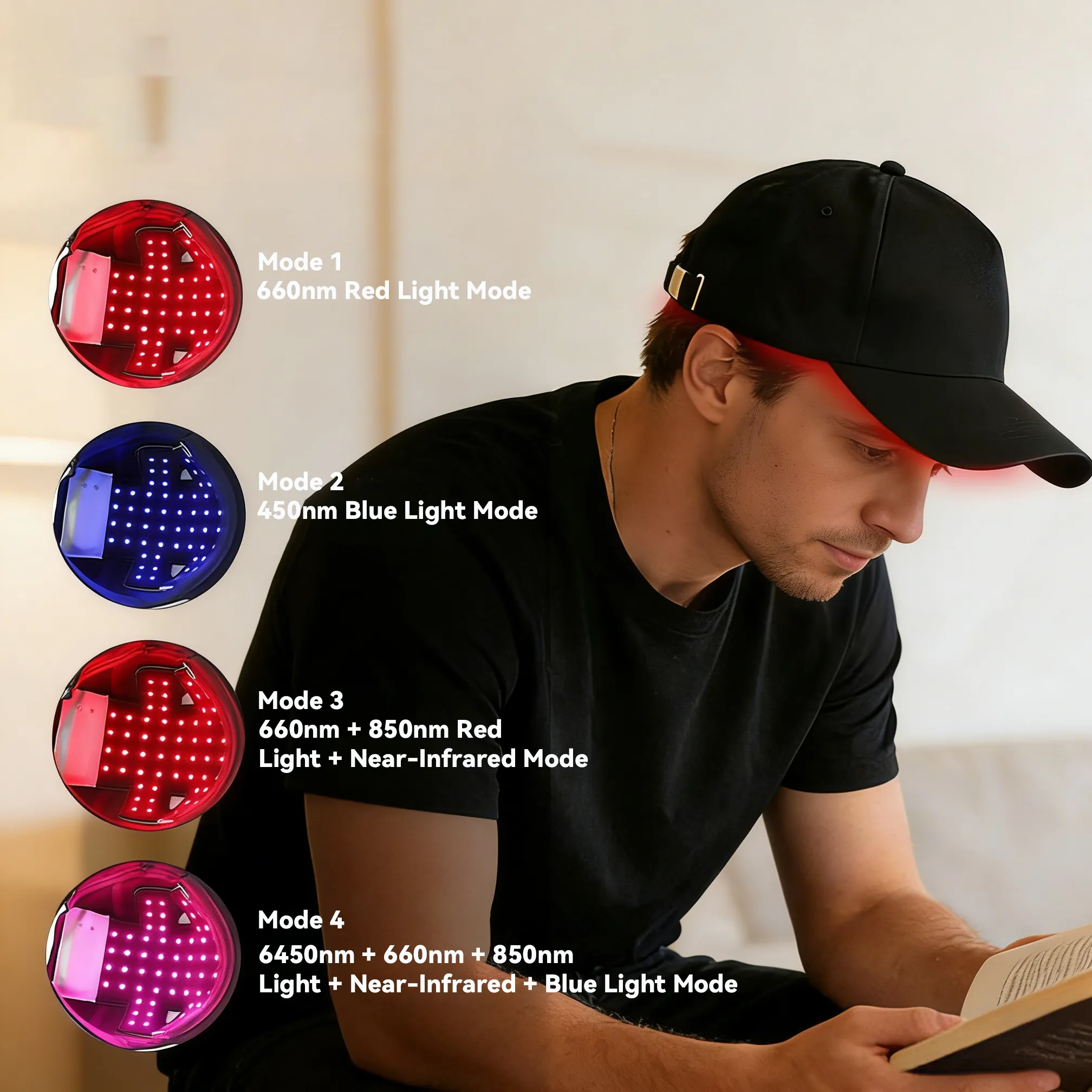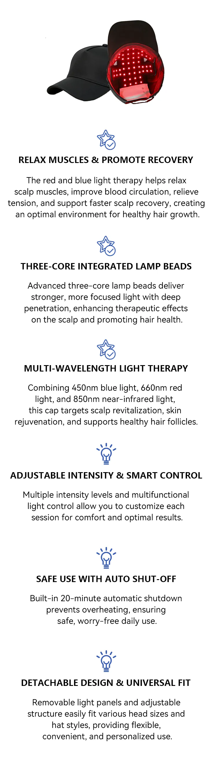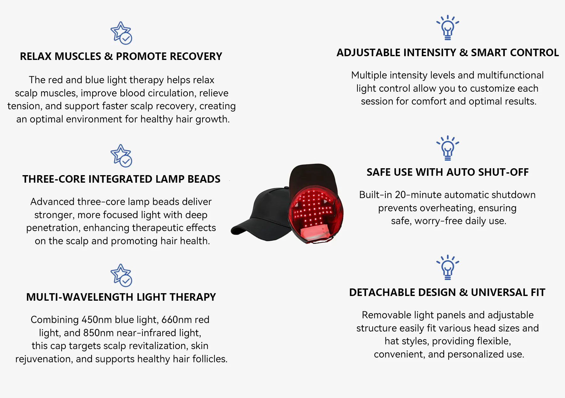 It uses red, blue, and near-infrared light therapy (450nm + 660nm + 850nm) with three-core lamp beads to stimulate the scalp, improve circulation, relax muscles, and promote hair regrowth, especially for receding hairlines, bald spots, or severe hair loss.