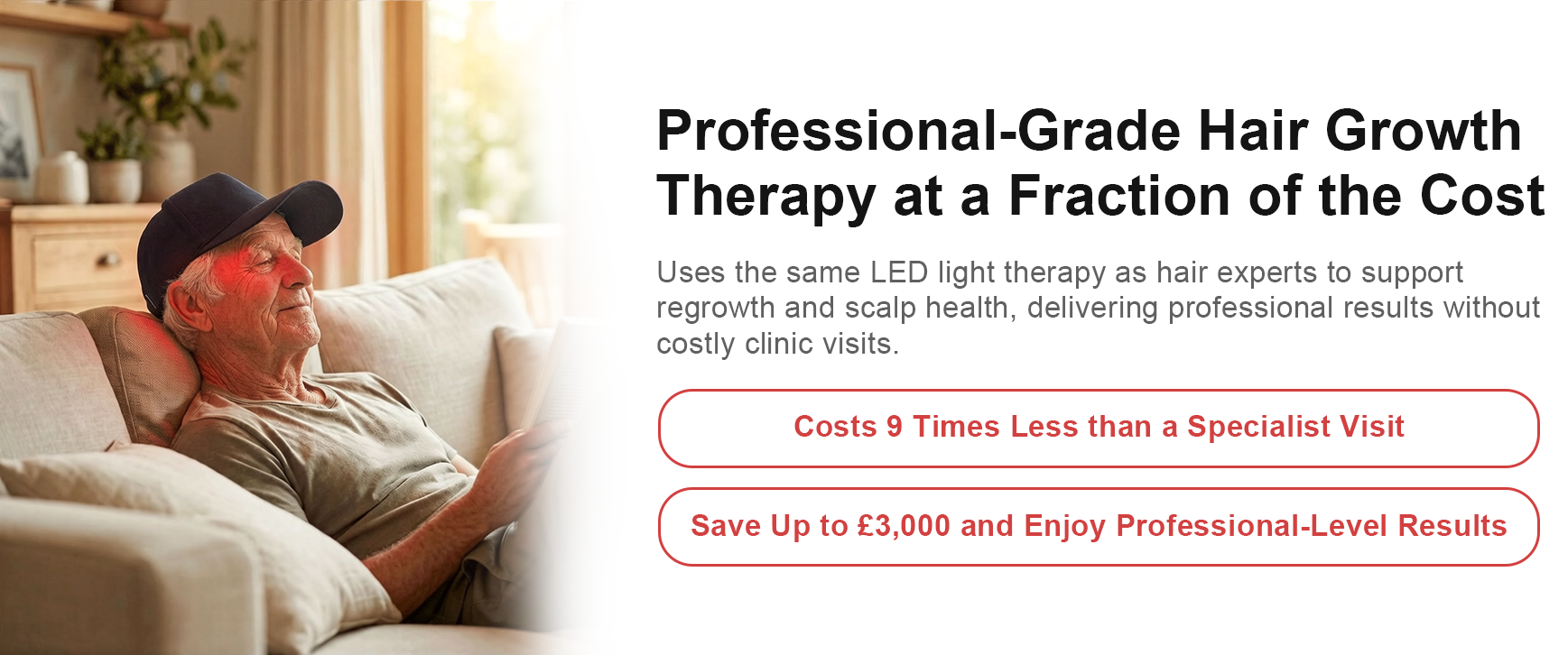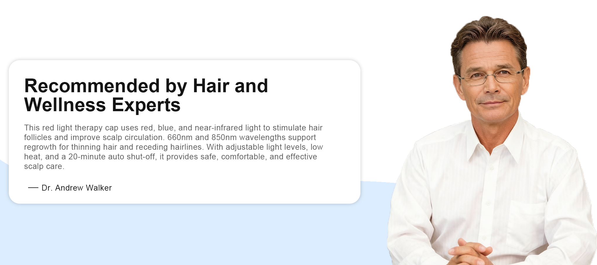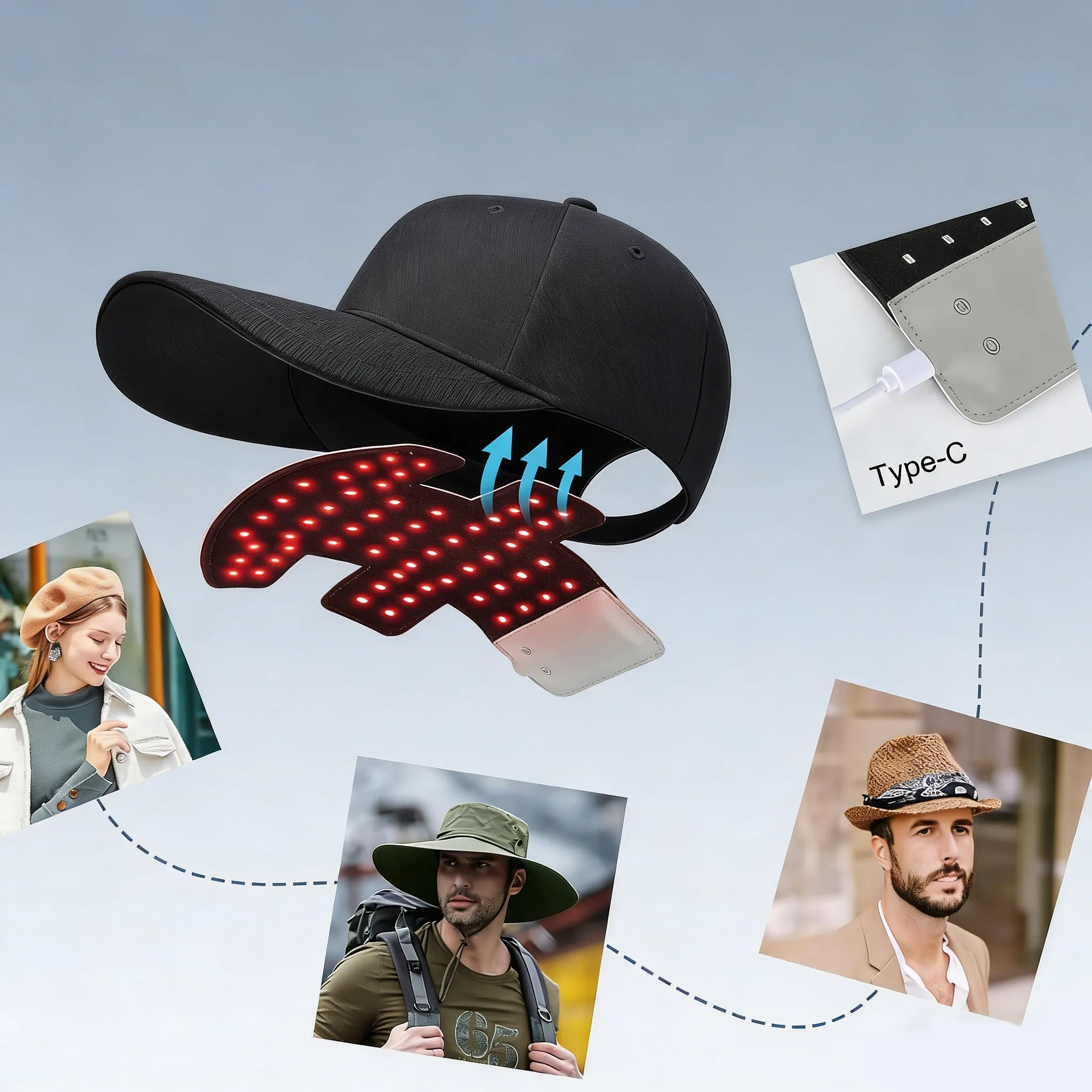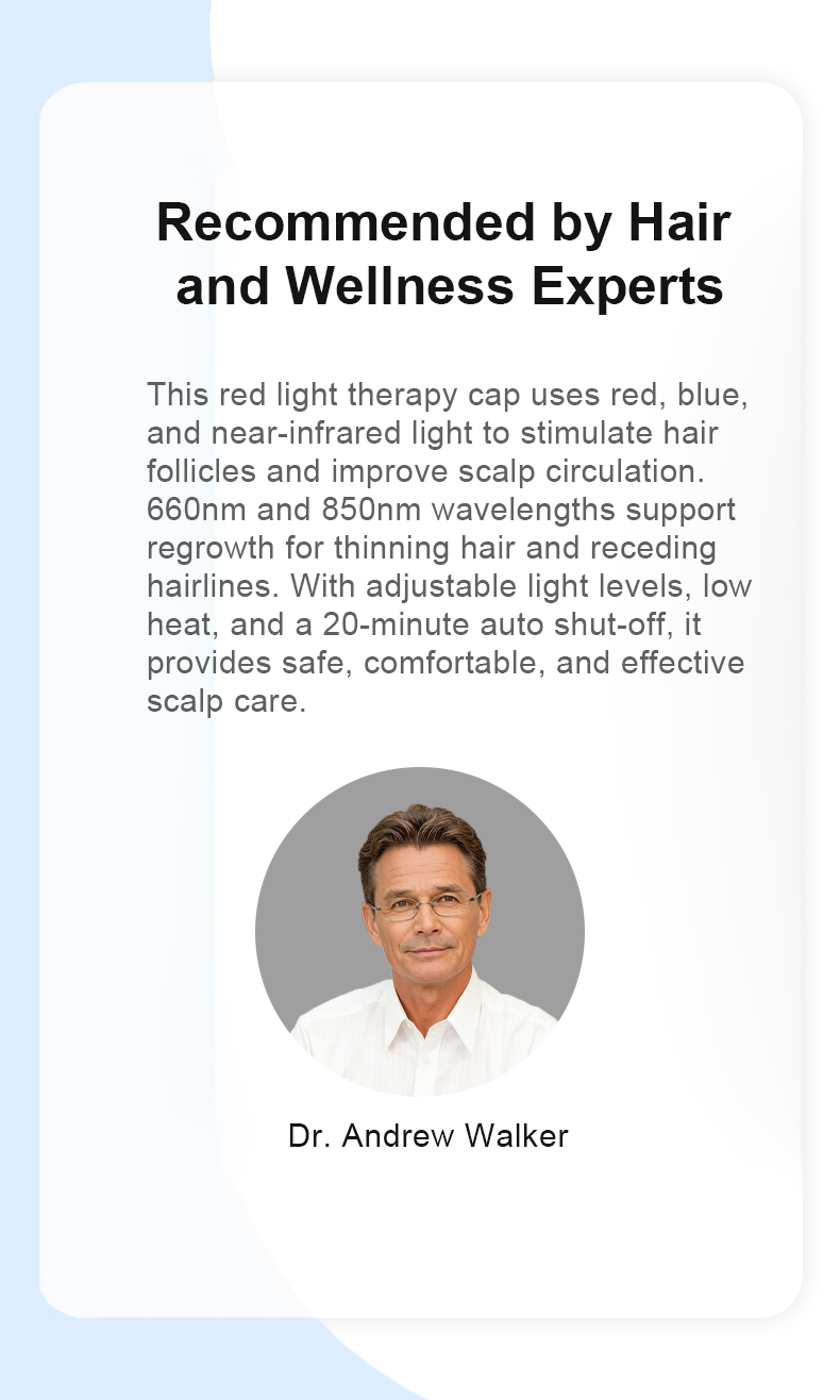 It uses red, blue, and near-infrared light therapy (450nm + 660nm + 850nm) with three-core lamp beads to stimulate the scalp, improve circulation, relax muscles, and promote hair regrowth, especially for receding hairlines, bald spots, or severe hair loss.